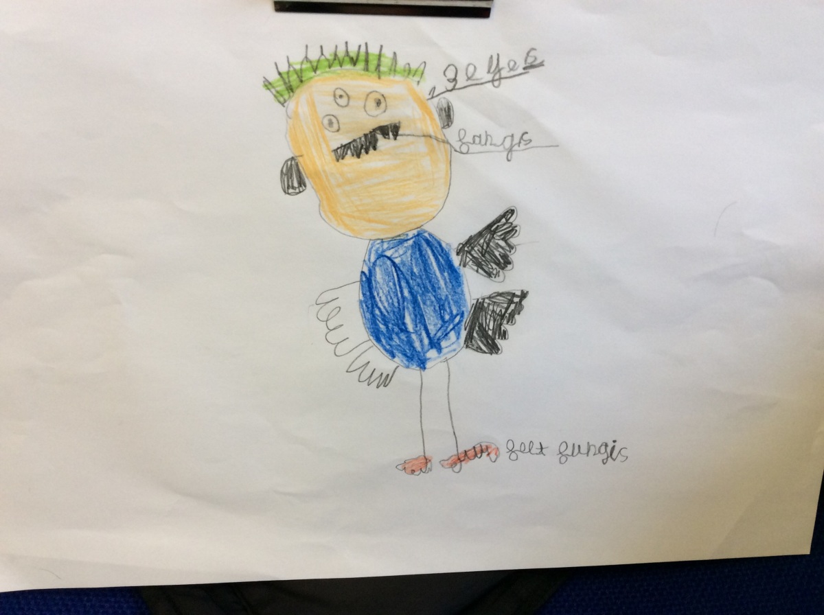 He has chocolate for hair and he has berries on his legs. His nest is made from green slime. He has milkshake on his hands and caramel on his belly. His lair is like a rainbow.