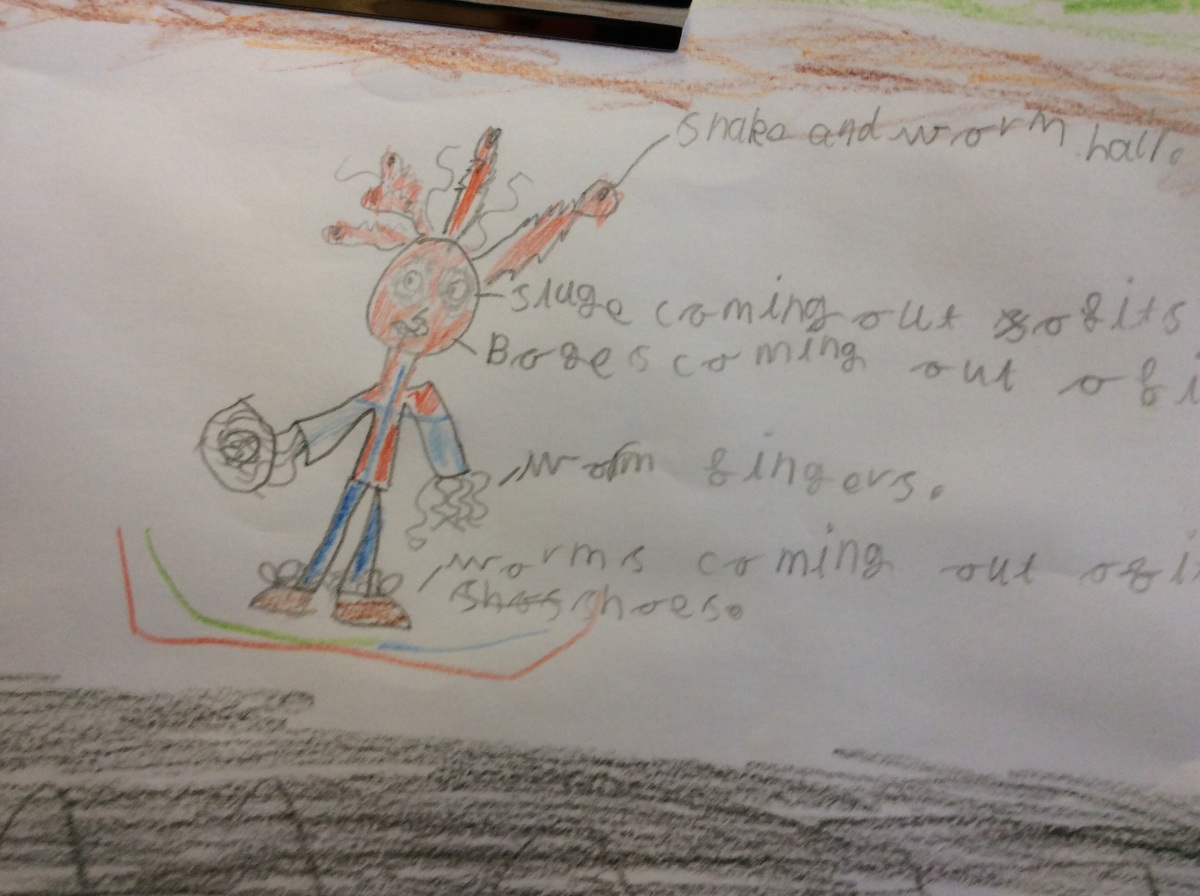 He has slimy snake and worm hair and slugs coming out of his eyes. Bogies fall from his nose and he has worms for fingers. He sleeps in a wet dog basket and eats worms with sludge sauce.